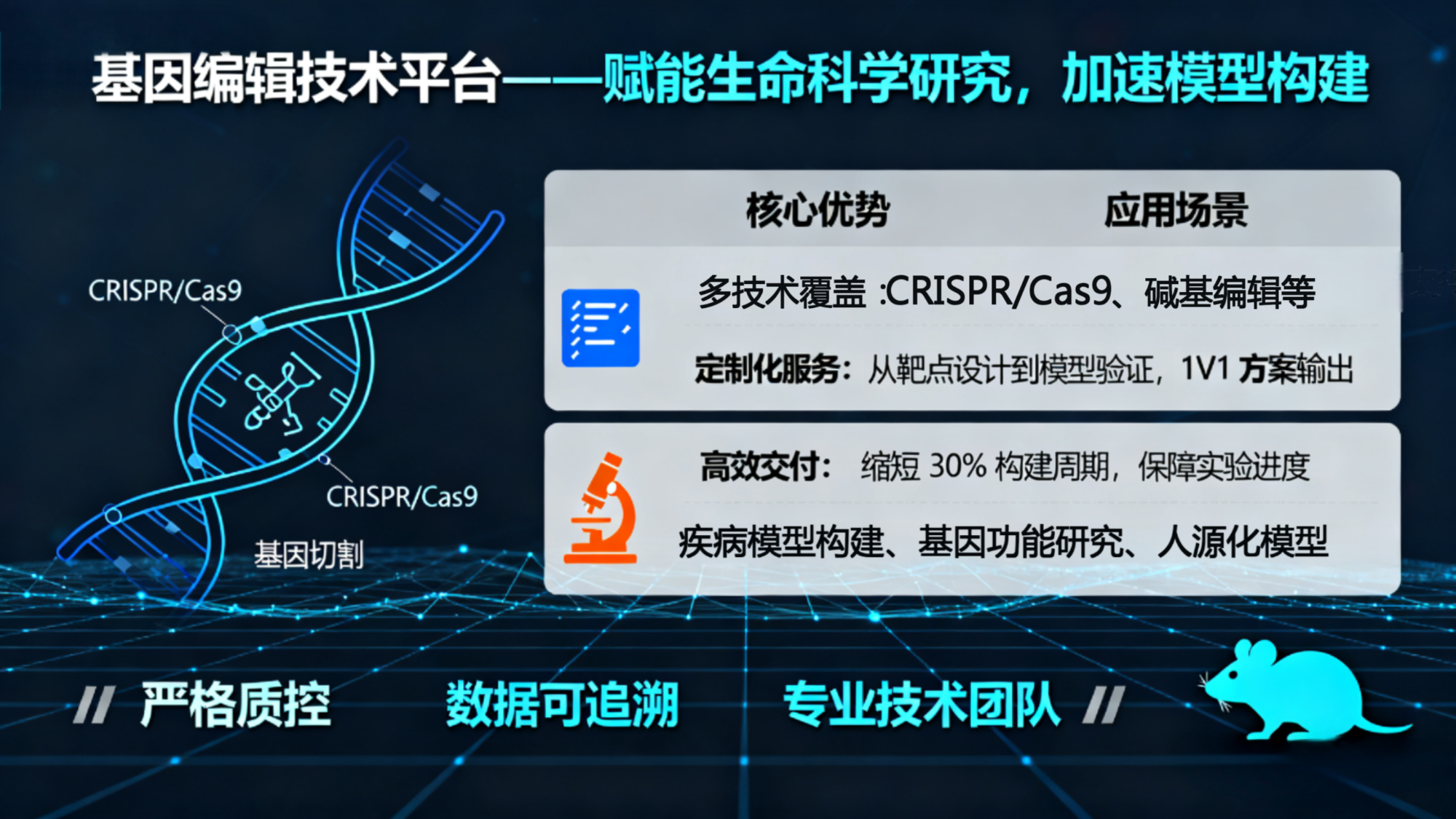 基因編輯模型:提供CRISPR/Cas9等先進(jìn)基因編輯技術(shù)定制的小鼠基因敲除、敲入、點(diǎn)突變模型,精準(zhǔn)模擬人類遺傳性疾病。